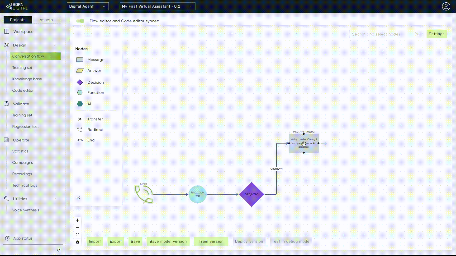 In [Step 6. ](https://docs.borndigital.ai/digital-agent/building-new-projects/..#step-6.-training-and-playing)observe the application of data from the *"Namex"* function across two rows. Feel free to experiment with other entities within the ***'Answer' node***.