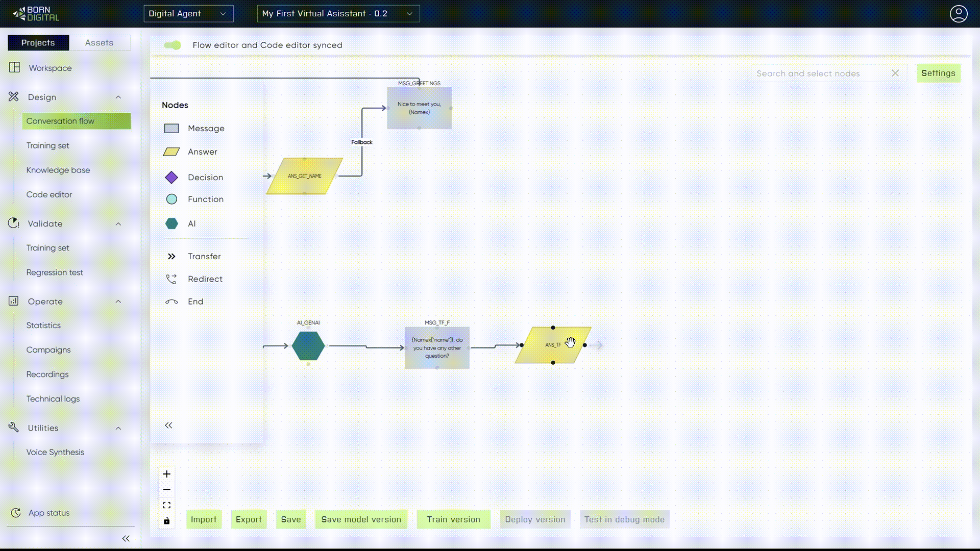 2. Generate a new message node, "Please write your answer below," connected to the generative AI node for the "YES" intent.
