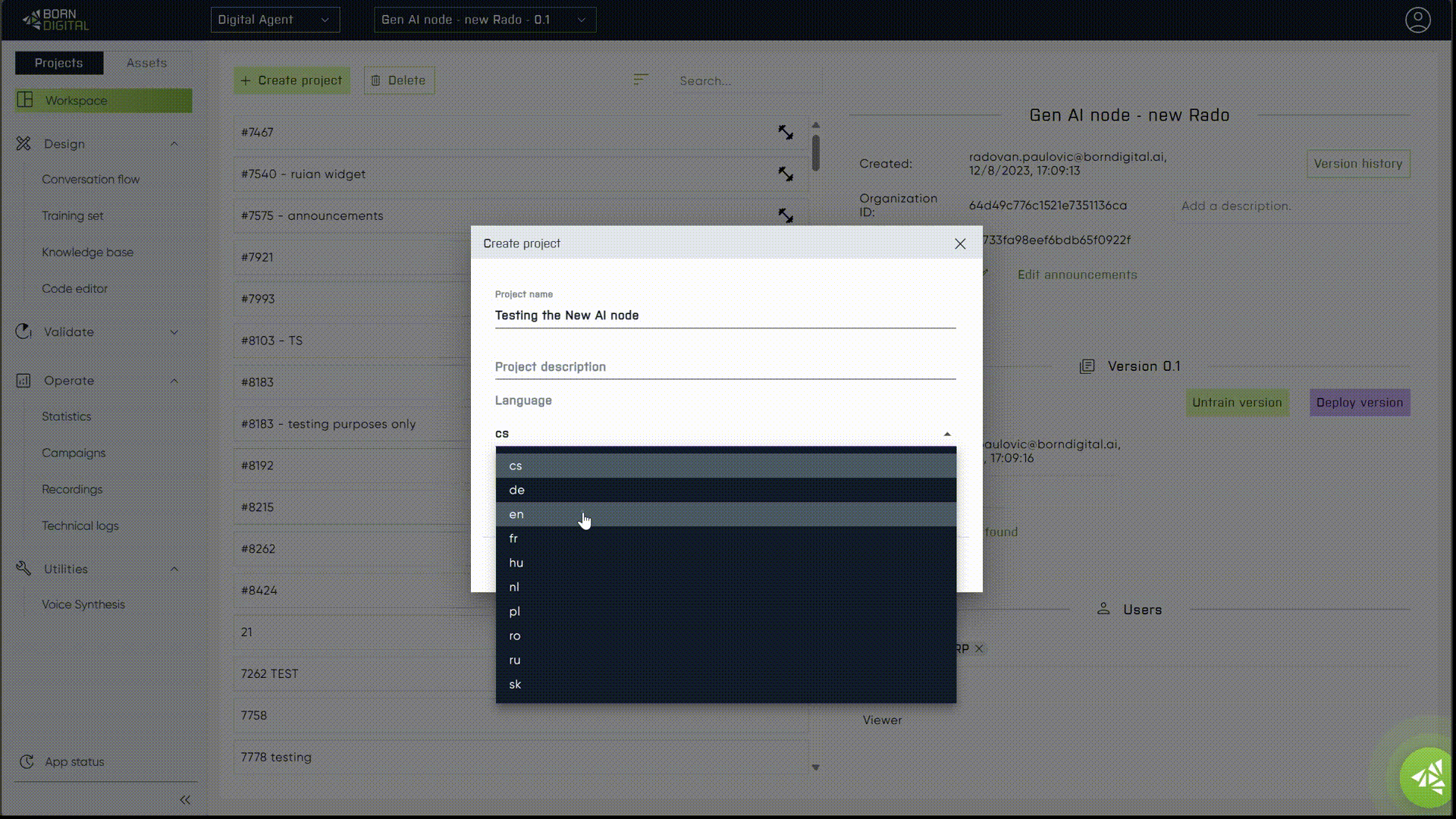 To understand and showcase the 'Generative AI' node effectively, we recommend visiting the ['Message' node](https://docs.borndigital.ai/digital-agent/conversation-flow/nodes-explained/message-node),[ 'Answer' node](https://docs.borndigital.ai/digital-agent/conversation-flow/nodes-explained/answer-node), ['Training Project'](https://docs.borndigital.ai/digital-agent/conversation-flow/launching-project) ,  and ['Create Project' ](https://docs.borndigital.ai/digital-agent/workspace/list-of-projects)pages for detailed insights.