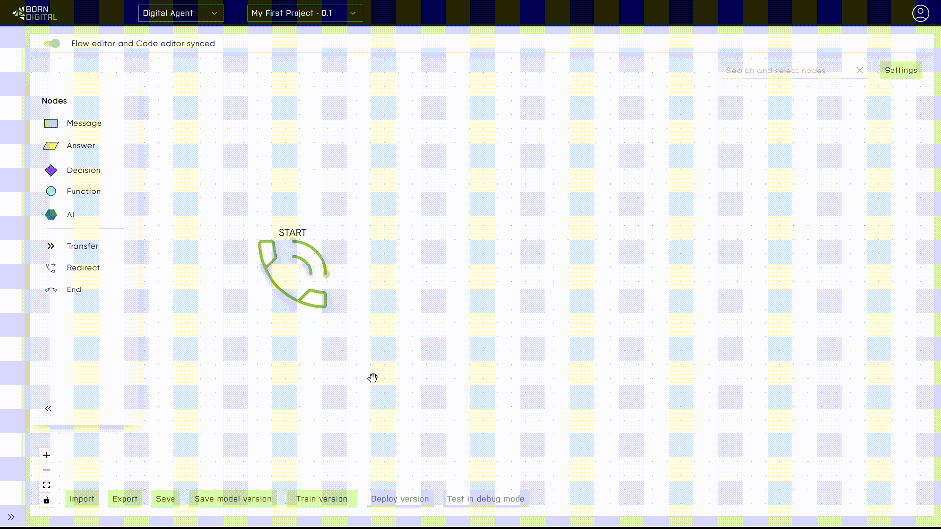 In this overview, the target node remains empty. Ensure you connect another node after the ['Function' node](https://docs.borndigital.ai/digital-agent/conversation-flow/nodes-explained/function-node) to continue the flow effectively.