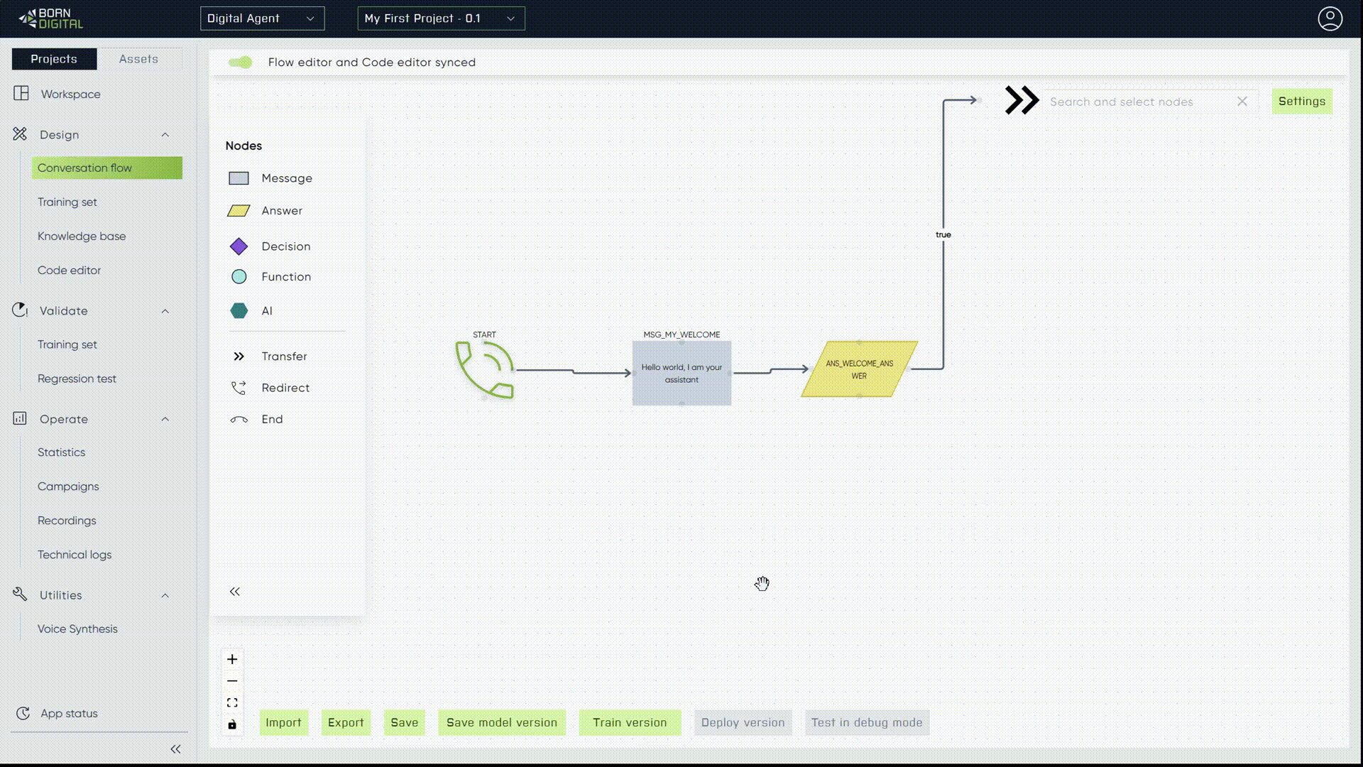 To create an[ 'End node'](https://docs.borndigital.ai/digital-agent/conversation-flow/nodes-explained/start-end-nodes), you can simply drag it from the nodes panel located on the right side of the interface. It's important to note that within a project, there is only one starting node, which acts as the singular point of conversation initiation.