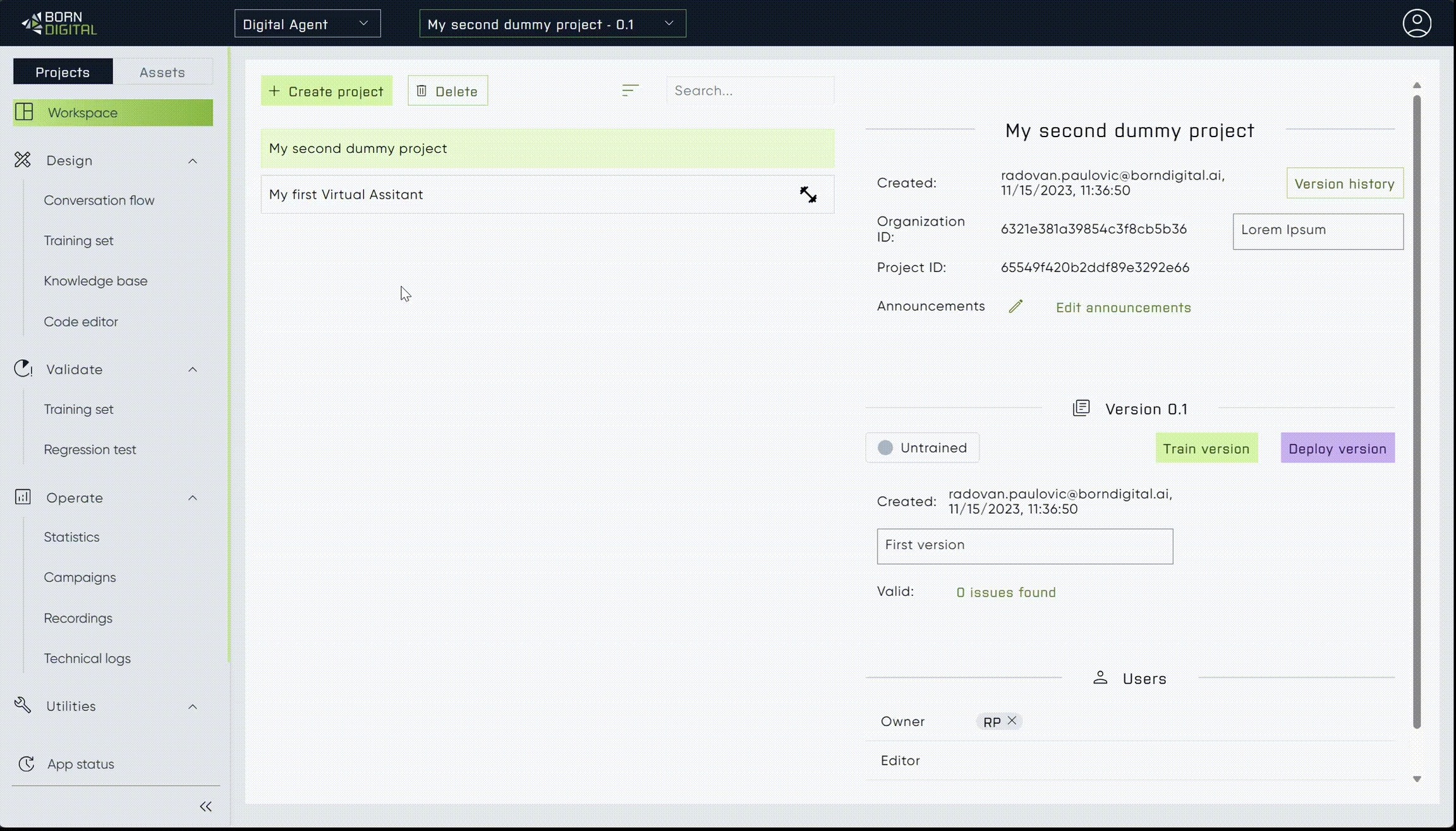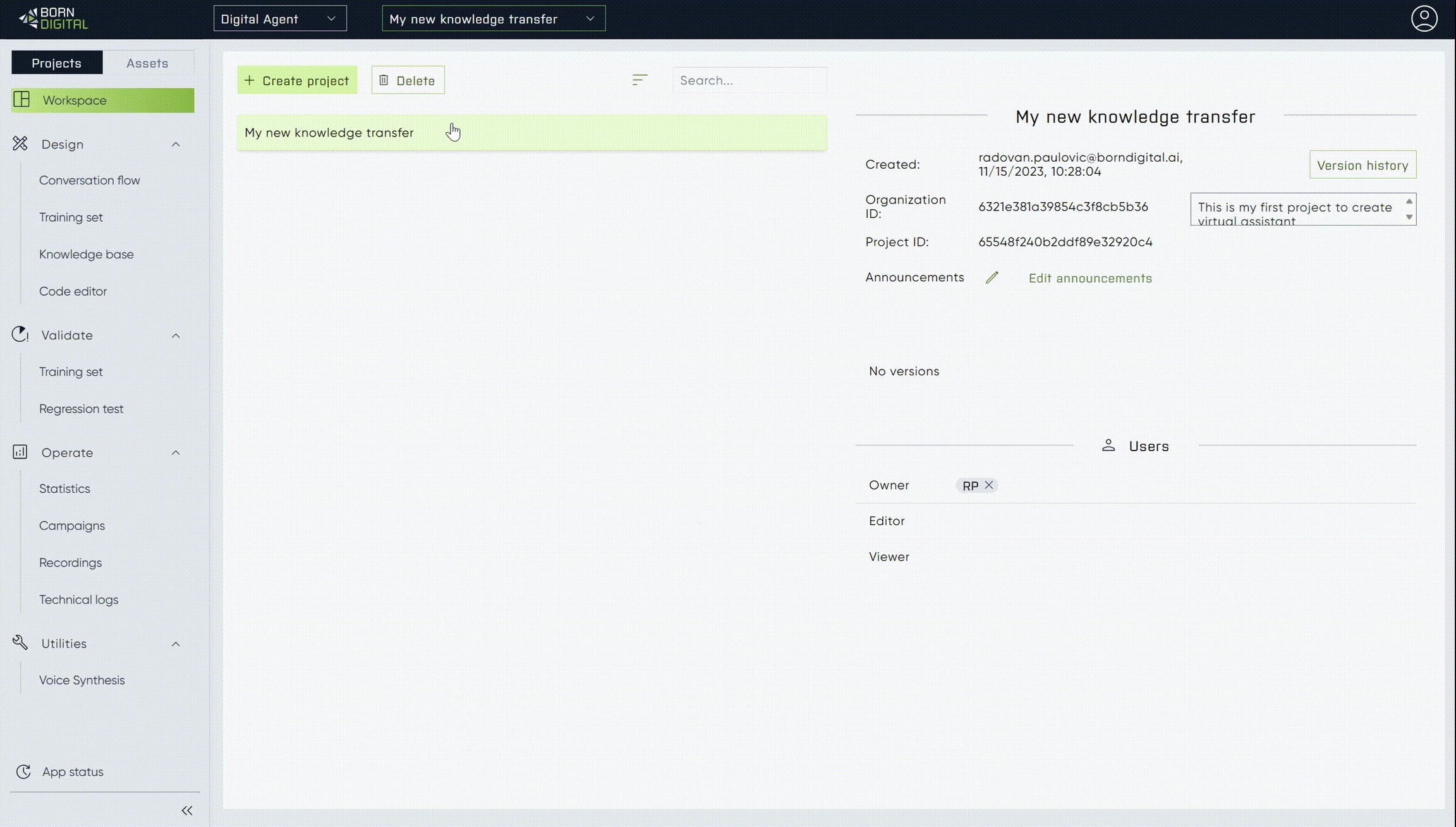 To delete a project, ensure that you have selected it within your workspace. Please note that this action is irreversible and will permanently remove the selected project. It's crucial to confirm that you've chosen the correct project for deletion, as this process is final and cannot be undone.