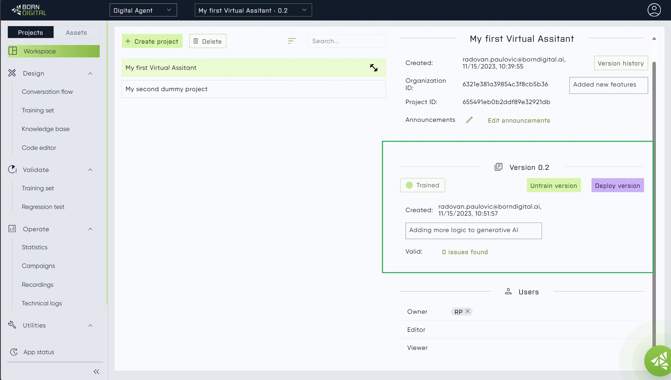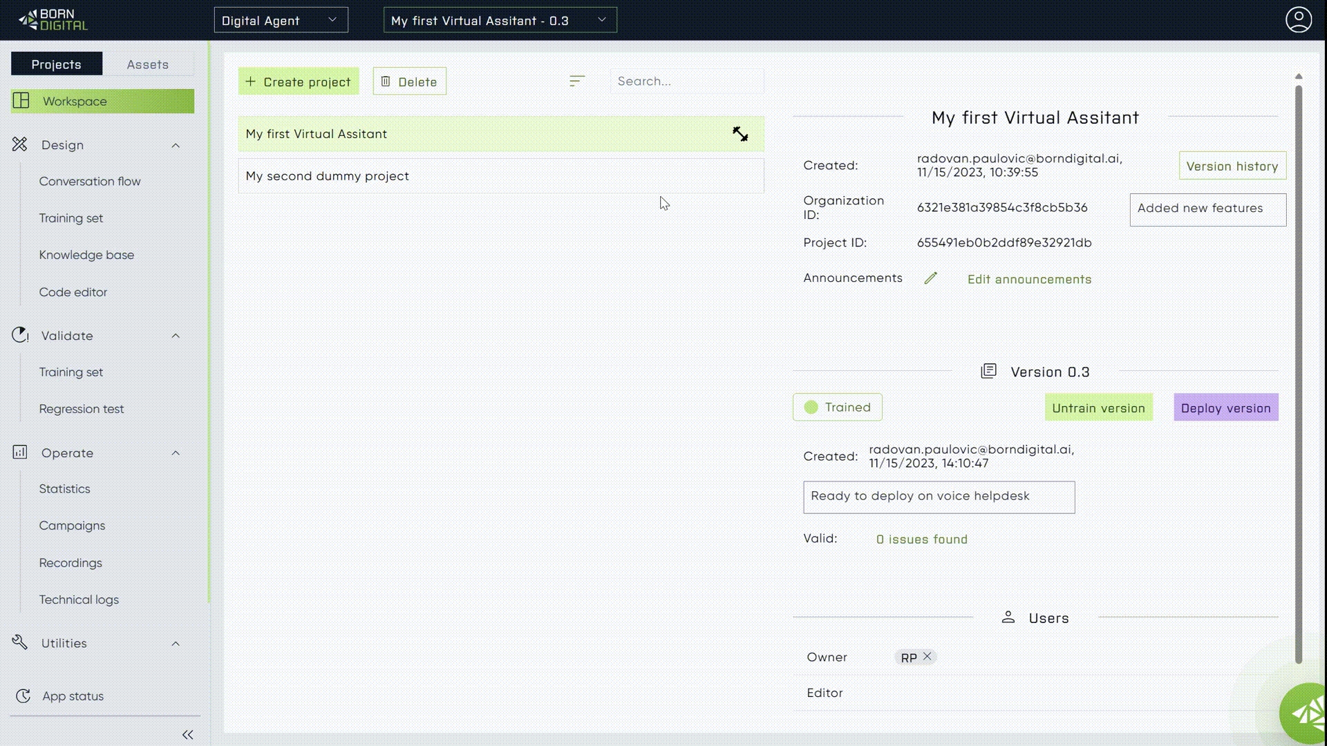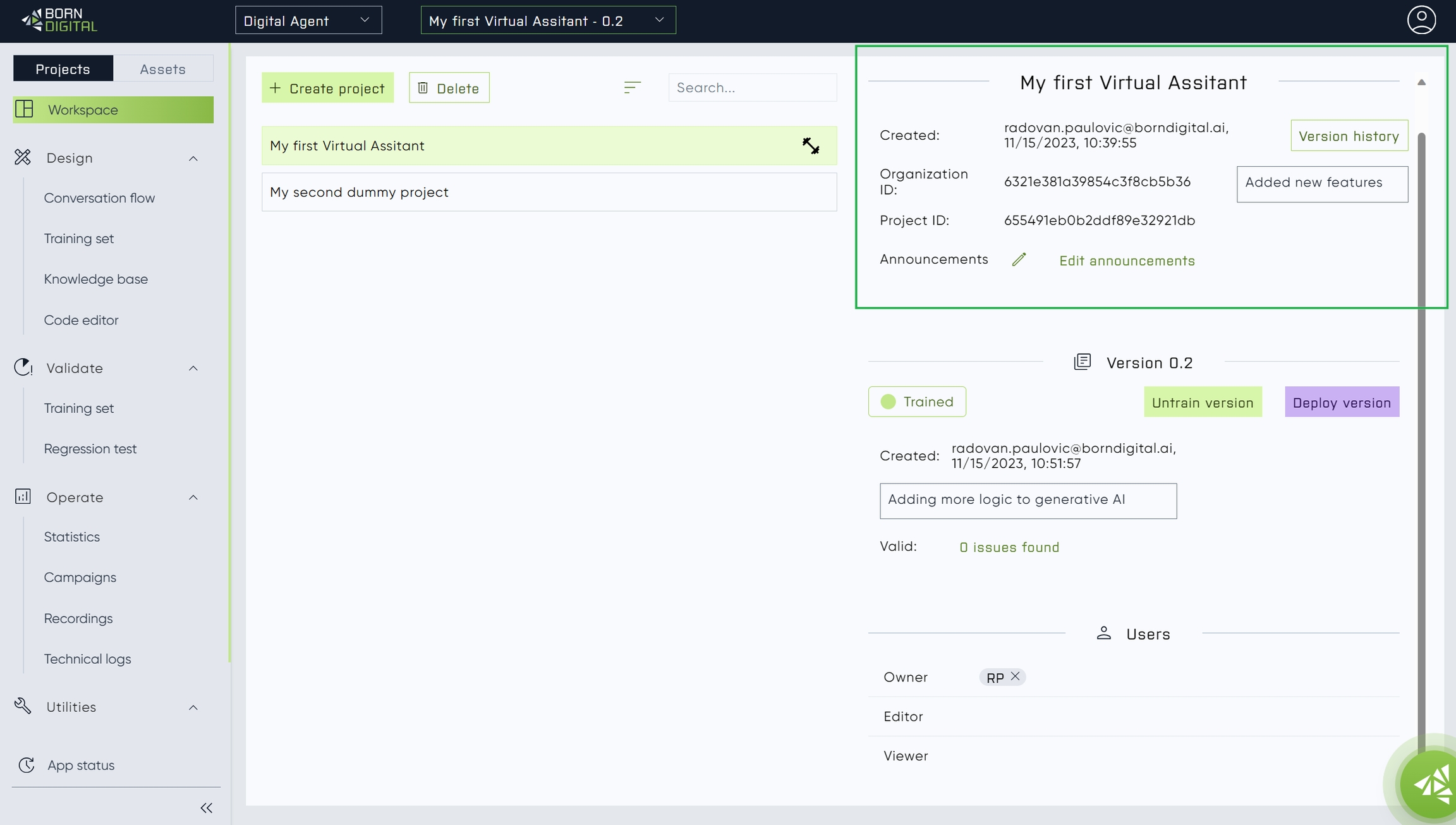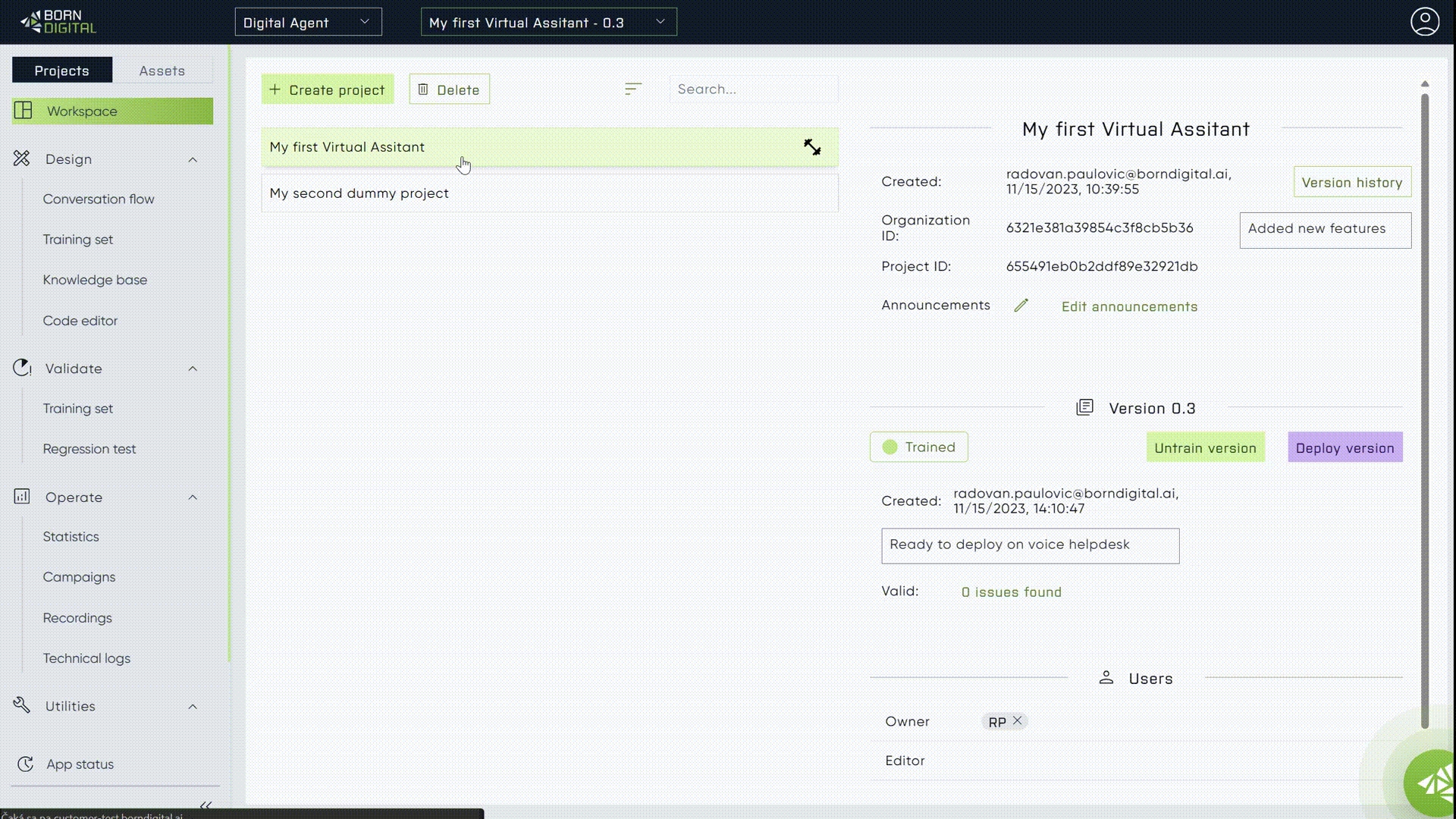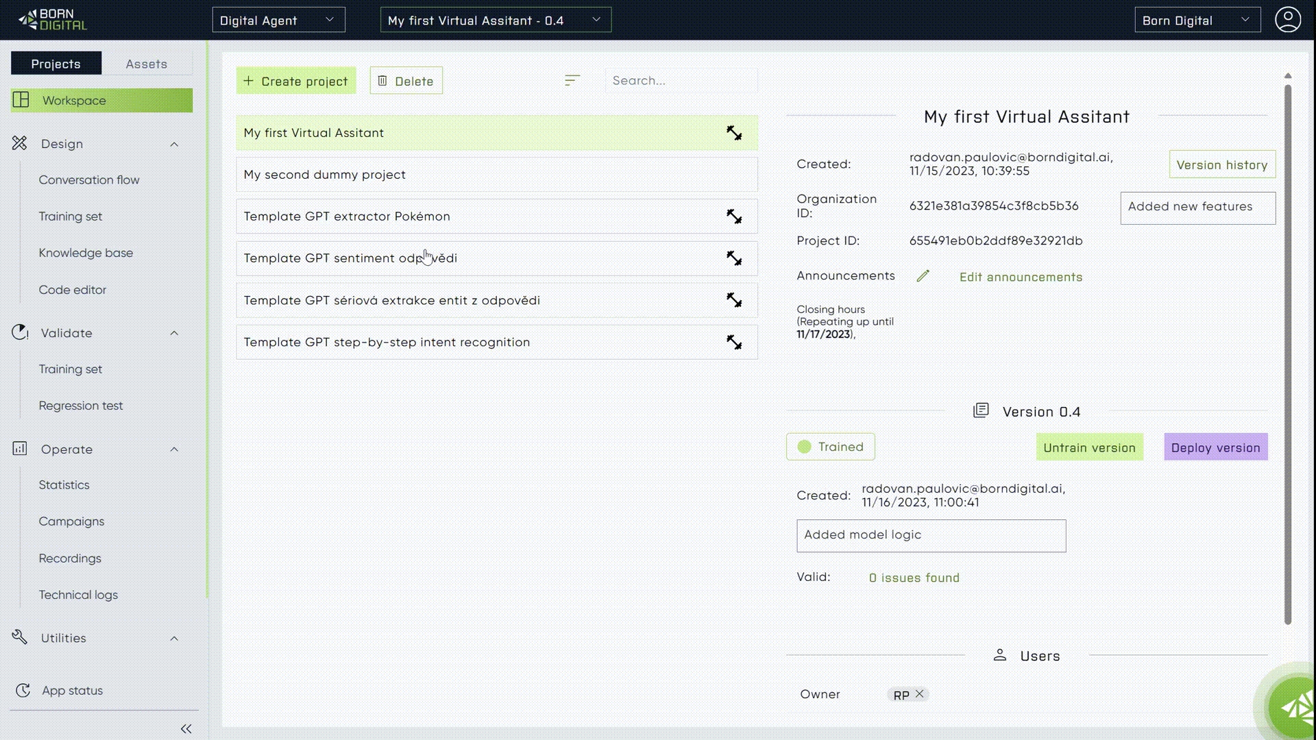 Digital studio supports versioning of the projects, to be able to do important changes without endangering working version. With that, user can always get back to the previous working version, or have the working version deployed and work on the new changes at the same time.