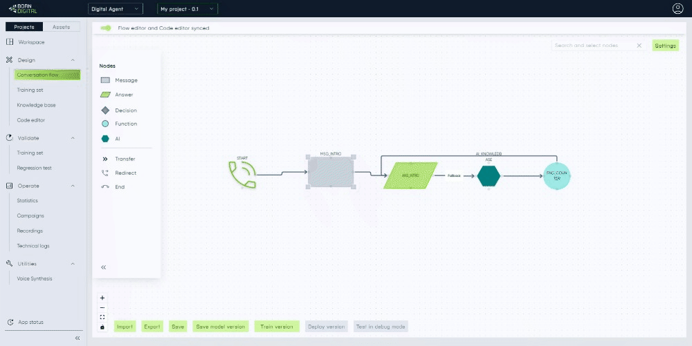 Craft compelling texts for your digital voice assistant. Insert your message into the *Speech* text window in the Message node.