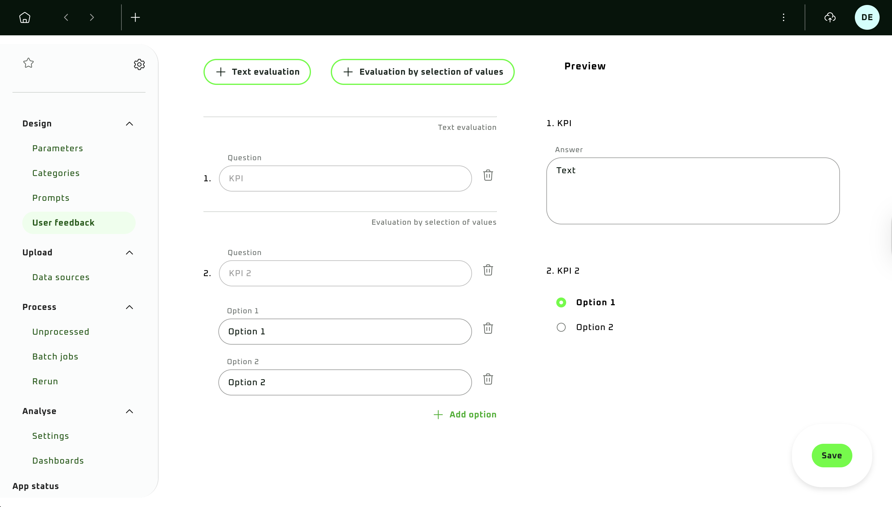 This module is for noting individual audio records or texts in the player for the dashboards users. You can configure the questions in the Evaluate button.