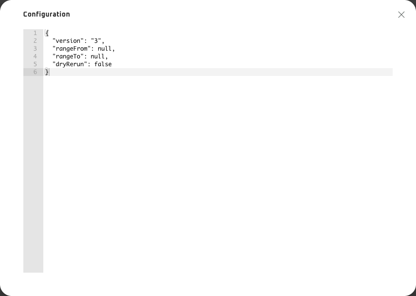 * **Configuration**: column displaying an icon button opening a window with a text editor displaying the configuration in JSON format
